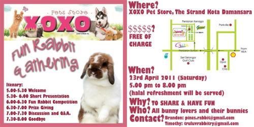 In the good spirit of Fellowship, Friendship & Fun, I would like to invite all rabbit lovers to come and join us for a Fun Rabbit Show & Gathering session. You can ask any questions and get first hand information about rabbits. Looking forward to meeting all of you for a fun filled evening.